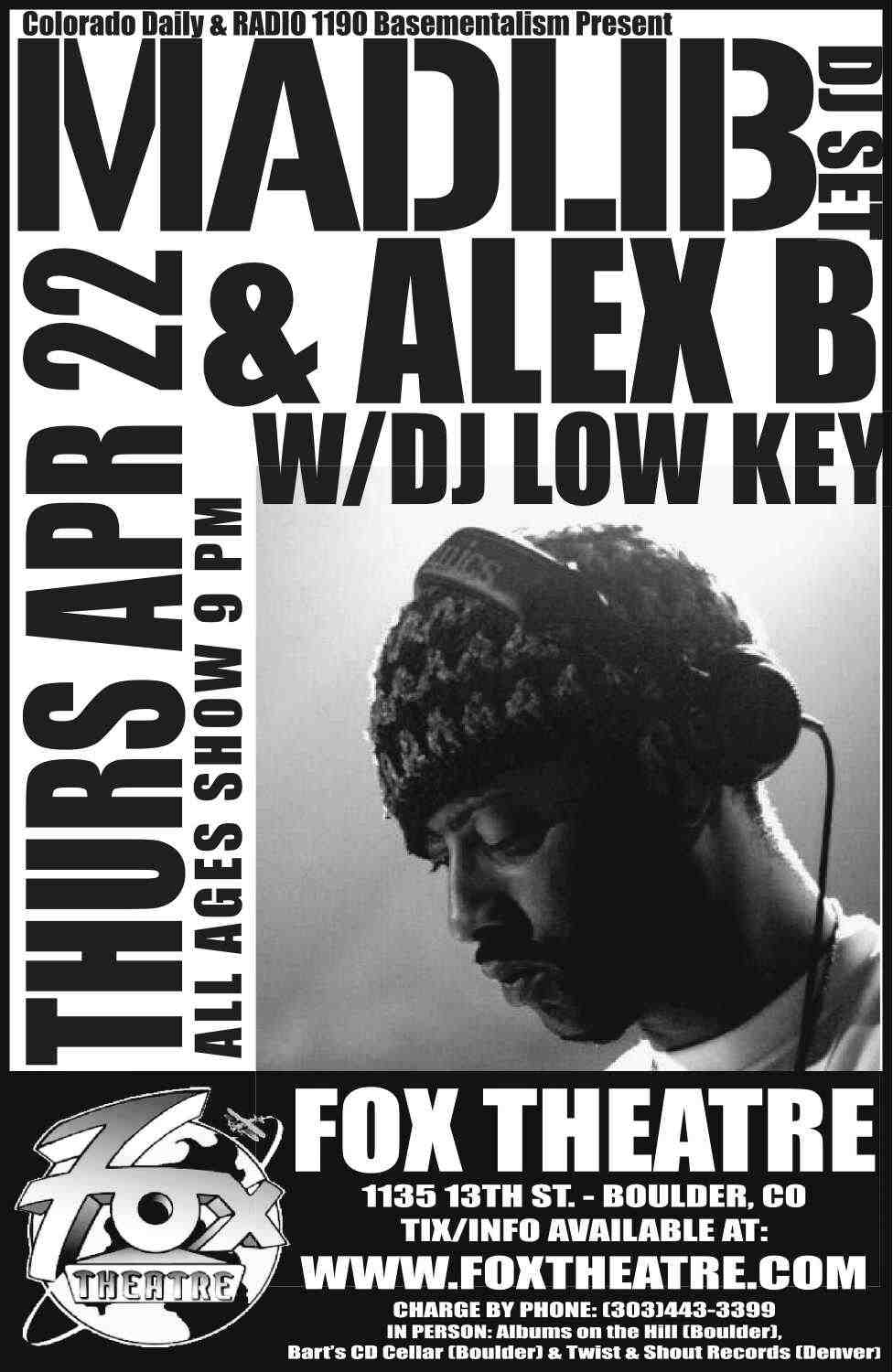 THURSDAY, 4/22 -> I have the honor of joining the Beat Konducta aka Lord Quas aka Madlib-erator aka Otis Jackson aka Madlib aka one of the best producers of our generation on a bill at the Fox!!!!! I don’t know if you can tell but I’m a little bit excited about it…LOL. And as if that wasn’t enough, Boulder producer extraordinaire Alex B is gonna be rocking as well. It should be a great night for hip hop heads, beatheads & production fans alike, don’t miss it. All ages / doors at 9 / Tickets are $18 presale, $23 day of show, and you can buy them here.
