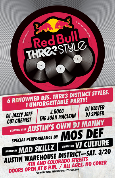 After the success of the Denver Thre3 Style, Red Bull hit me up to help organize & coordinate a unique Thre3 Style exhibition featuring some of the best DJs in the world. With that said, catch Jazzy Jeff, Cut Chemist, J Rocc, Klever, Spider & the Juan MacLean as they rock their best 30 minute megamixes featuring at least three genres of music. Skillz is our host for the party and Austin’s own DJ Manny is gonna set things off, plus we have a special last minute guest, the mighty MOS DEF!!! So while I’m not DJing this event, there’s no place I’d rather be on Saturday night, I promise this party will be epic, unforgettable party!!! All ages, no RSVP or wristbands required!!!