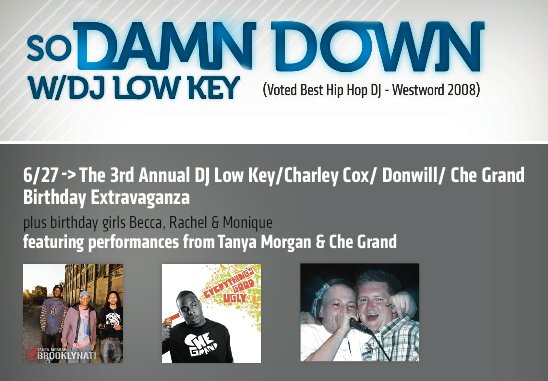 SATURDAY, May 30th -> Don’t miss Basementalism legend and 2006 Westword Best Hip Hop DJ winner Lazy Eyez as he joins me for a guest spot at my new Saturday night, So Damn Down, at Shag (830 15th St). It’s his first club set in over a year (I’m honored) and we’ll be rocking together for the first time ever despite working together on numerous parties and Basementalism in the past, I can’t wait. Y’all don’t wanna miss this, trust. $3 Svedka Vodkas & $2 PBRs all night / 21+ / No Cover / Music at 10.