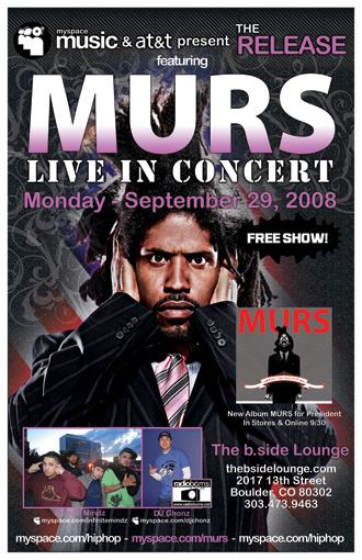 MONDAY, 9/29 -> Come celebrate the release of Murs’ major label debut, Murs For President, with a FREE show (alongside Infinite Mindz & DJ Chonz) in Boulder at the B-Side Lounge (2017 13th St). The show is completely free, on a first come, first served basis and knowing Boulder, I imagine the line will be thick early so come out early (doors are at 9) if you’re serious about seeing the show. If you don’t feel like lining up on Pearl Street, you can call in to Basementalism or enter the contest below to win spots on the list and skip the line. P.S. I won’t be spinning but I’ll be in the house supporting Murs & the homey Chonz. If you’re interested in coming out and not waiting in line, e-mail contests@djlowkey.com with the name of the DJ crew that me & Chonz are a part of to be entered to get spots on the list and to skip the line/ensure you’ll be able to get in.