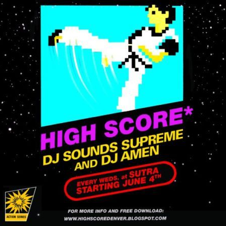 The words of the homey Sounds Supreme -> Starting June 4th and Every Wed. Night @ Sutra (10th and Lincoln) DJ Amen & myself will be throwing a weekly that Denver has never seen. Playing a eclectic mix of Baile Funk, Electro, Hip Hop, BMORE and really whatever we deem as fresh. High Score is taking it back to the Original Nintendo era where all you had to worry about was finding that one house party to shake you ass and drink 40’s at. With a FREE Keg on the dance floor every night and ridiculous drink special from ABSOLUTE Vodka this is exactly what we will accomplish. Not to mention there is never a cover and nightly give-a-ways from Denver’s newest boutique FAMILY AFFAIR. Come Join us June 4th with Special Guest DJ’s: Chonz, A What!, Cysko Rokwell, & Chino Rey. Wed Nights just got fun again. Mom’s welcome.