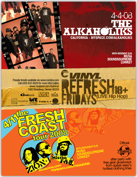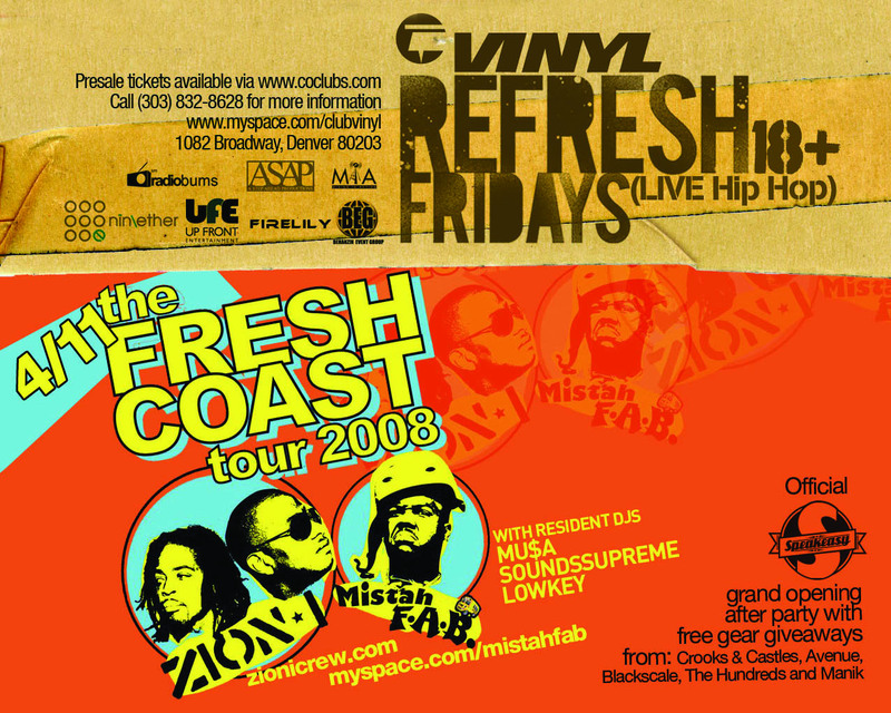 Then on Friday, 4/11 -> Don’t miss the official Speakeasy Grand Opening Afterparty w/Zion I, Mistah F.A.B., DJ Low Key, Sounds Supreme & more at Vinyl’s Refresh Fridays. Denver’s newest street wear spot, Speakeasy (70 Broadway, next to the Hornet), will be celebrating their grand opening with giveaways from their DOPE in house brand, Avenue, all night, plus giveaways from other top notch clothing companies including Crooks & Castles, Manik, the Hundreds & more. Hit up the store’s grand opening earlier in the day for discount passes to get into the afterparty and some of the best gear in town. Doors at 9/$10 for 21+/$15 for 18+/Discount passes at Speakeasy during the day.